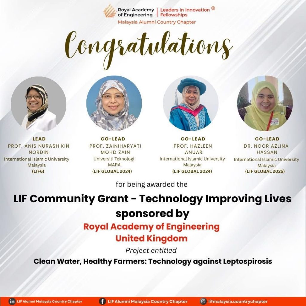 The Malaysia Alumni Country Chapter of the Royal Academy of Engineering – Leaders in Innovation Fellowships (LIF) proudly celebrates the outstanding achievement of four distinguished Malaysian researchers for being awarded the LIF Community Grant – Technology Improving Lives, sponsored by the Royal Academy of Engineering, United Kingdom.