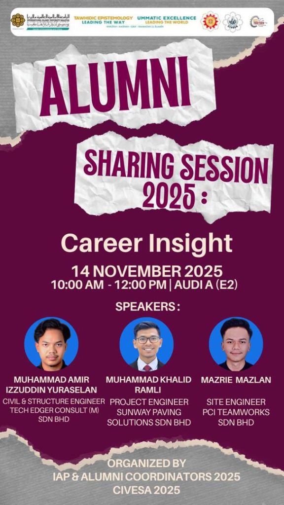 The session featured three distinguished alumni speakers from diverse sectors within the engineering industry. Mr. Muhammad Amir Izzuddin Yuraselan, currently serving as a Civil and Structural (C&S) Engineer at Tech Edger Consult (M) Sdn. Bhd., shared his professional experiences in consultancy, highlighting key technical competencies, project involvement, and the importance of continuous learning in design practice. Mr. Muhammad Khalid Ramli, a Project Engineer at Sunway Paving Solutions Sdn. Bhd., provided valuable perspectives on project execution, site coordination, and the challenges of managing infrastructure works within tight timelines and quality requirements. Meanwhile, Mr. Mazrie Mazlan, a Site Engineer from PCI Teamworks Sdn. Bhd., offered practical insights into site operations, construction management, and the realities of working in a fast-paced engineering environment.